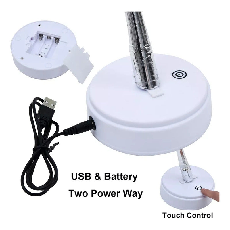 Funciona tanto con USB como con 3 pilas AA (no incluidas), y cuenta con un interruptor táctil ON/OFF. Su bajo voltaje garantiza una iluminación segura, sin sobrecalentamientos.